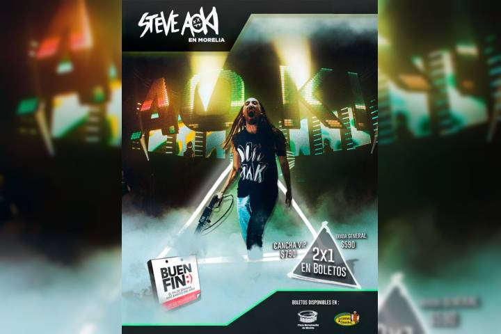 En el marco del Buen Fin 2017, y con el objetivo de que nadie se quede fuera de la presentación en Morelia de uno de los mejores DJs en el mundo, Steve Aoki, a partir de las de las 15:00 horas de este viernes, se habilitó la promoción 2x1 para las Zonas de General y Cancha VIP, que tienen un costo de 590 pesos y 790 pesos, respectivamente (Los antes mencionados no incluyen cargo por servicio)