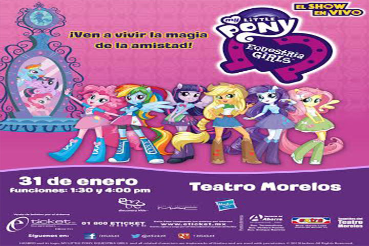 El próximo 31 de enero, el Show en Vivo original de Hasbro "My Little Pony y Equastria Girls" se presentará en el Teatro Morelos El show mágico de colores y luces, realizará trece cambios de escenografía y participarán doce personajes de la serie animada con mágicas transformaciones, podrán disfrutar de la más alta tecnología en audio, iluminación y efectos especiales, increíbles vestuarios, música para que puedan cantar y bailar ...
