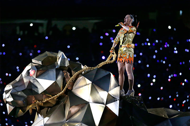 NOTICIAS 01/02/2015Katy Perry presenta gran producción en medio tiempo del Super Bowl XLIXLa cantante estadunidense Katy Perry cumplió en su show de medio tiempo del Súper Tazón XLIX, al presentar un gran despliegue de producción, además de leones y tiburones, junto con sus invitados especiales, Lenny Kravitz y la rapera Missy Elliott.