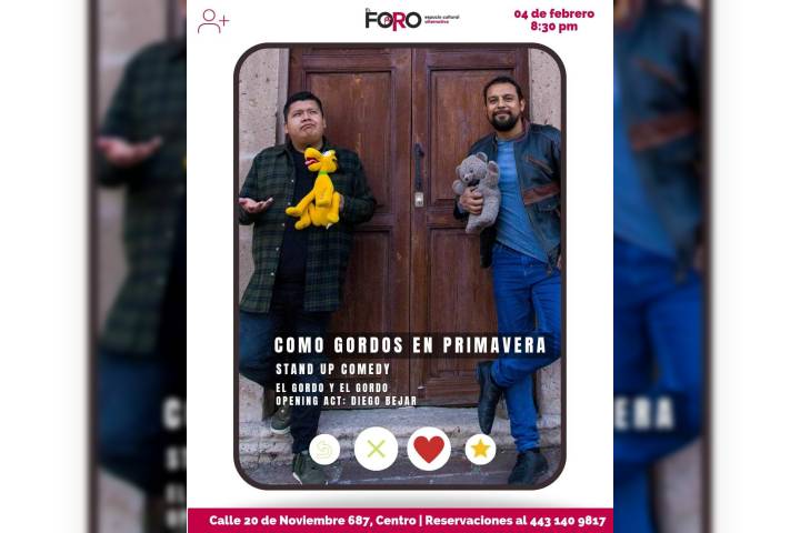 El Gordo y El Gordo, dúo cómico integrado por Javier Magaña y Mane Guevara presentarán su show "Como gordos en primavera" este sábado 18 de marzo en las instalaciones del foro espacio cultural alternativo en la ciudad de Morelia.