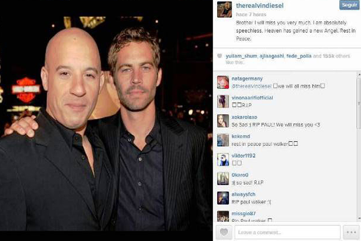 Mark Sinclair Vincent, más conocido como Vin Diesel, quien compartió escena con Paul Walker en la exitosa saga de acción "Rapidos y Furiosos", escribió un emotivo mensaje tras su muerte. En su cuenta de Instagram, Diesel publicó una foto suya junto al actor con el siguiente mensaje: "Hermano te voy a extrañar muchísimo. Estoy sin palabras. El cielo ha ganado un nuevo ángel. Descansa en paz". El Porsche en el que viajaba Walker jun...