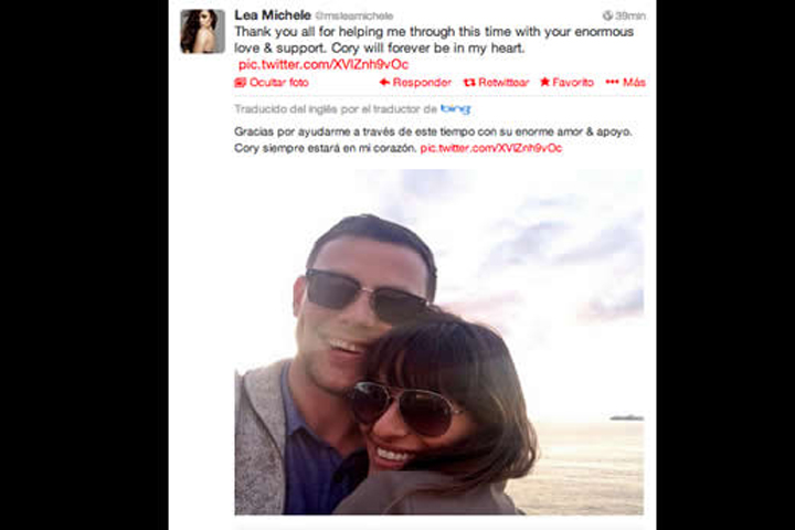 La actriz de la serie Glee, Lea Michele, rompió el silencio este lunes desde la repentina muerte de su novio y compañero de reparto, Cory Monteith, al enviar un mensaje de agradecimiento a través de su cuenta de Twitter. Hasta ahora la actriz había pedido privacidad. "Gracias a todos por ayudarme en este tiempo con su enorme amor y apoyo. Cory siempre estará en mi corazón", tuiteó este lunes Michele y acompañó el mensaje con una fotog...