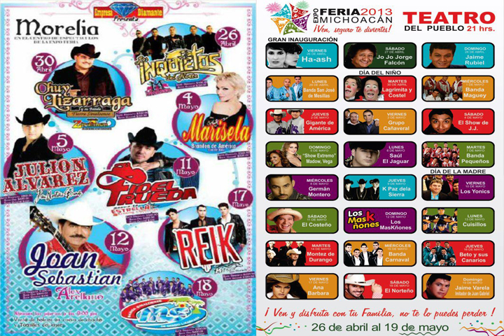 NOTICIAS 15/04/2013Difunden cartel de artistas del Teatro del Pueblo y del Centro de EspectáculosPrevio a la tradicional rueda de prensa donde las autoridades de la Comisión de Ferias, Eventos y Exposiciones del Estado de Michoacán (COFEEEM) realizan con los medios de comunicación para informar sobre las diversas actividades que se realizarán, así como las presentaciones artísticas en el Teatro del Pueblo y el Centro de Espectáculos, en su red social de Facebook han circulado imágenes anunciando los conciertos.