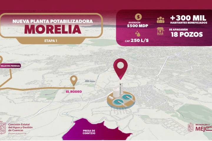 NOTICIAS 09/02/2026Agua garantizada para 300 mil morelianos; Bedolla anuncia nueva planta potabilizadora de 500 mdp Como parte del Plan Michoacán por la Paz y la Justicia, el gobernador Alfredo Ramírez Bedolla anunció que se construirá en Morelia una nueva planta potabilizadora para beneficio de 300 mil habitantes de la zona poniente, con una inversión conjunta de 500 millones de pesos.