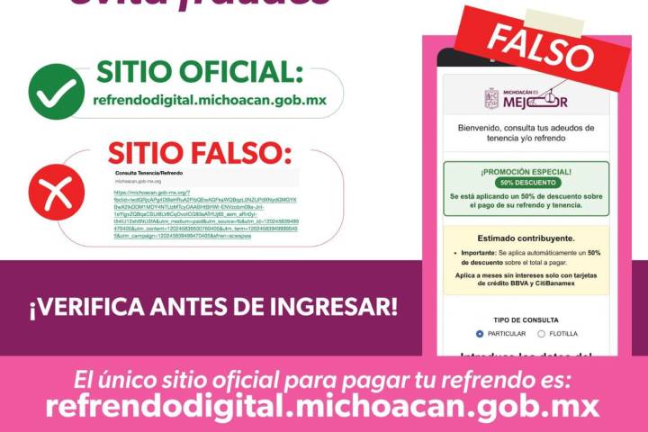 Ante el incremento de páginas que en redes sociales ofrecen descuentos y promociones en refrendos, licencias de conducir y diversos trámites vehiculares, la Secretaría de Finanzas y Administración, a través del Servicio de Administración Tributaria de Michoacán (Satmich), alerta a la población para que no se víctima de engaños y fraudes. Trámites como el refrendo vehicular se realizan digitalmente en la página https://refrendodigi...
