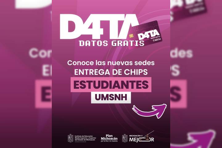 NOTICIAS 25/03/2026¡Atención nicolaitas! Módulos del Programa D4TA llegan a Lázaro Cárdenas, Uruapan y ZamoraPara acercar los beneficios del Programa D4TA Datos Gratis a todas las regiones del estado, el Instituto de Educación Media Superior y Superior del Estado (Iemsysem) invita a estudiantes de la Universidad Michoacana de San Nicolás de Hidalgo (UMSNH) a conocer y acudir a las sedes habilitadas en el interior del estado para recoger y activar su chip con internet gratuito.