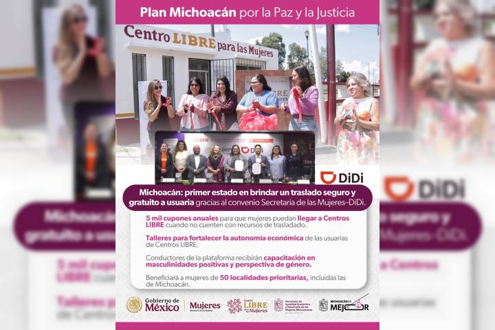 NOTICIAS 01/12/2025Michoacán, primer estado en brindar traslado seguro tras acuerdo entre Seimujer y DiDi La secretaria de Igualdad Sustantiva y Desarrollo de las Mujeres Michoacanas, Alejandra Anguiano González, informó que gracias al convenio firmado a nivel nacional entre la Secretaría de las Mujeres del Gobierno de México y la plataforma DiDi, Michoacán se convirtió en el primer estado del país en otorgar un traslado seguro a una usuaria que requería acudir a un espacio de atención y regresar a su hogar sin riesgo, mediante los cupones ... Ver más...