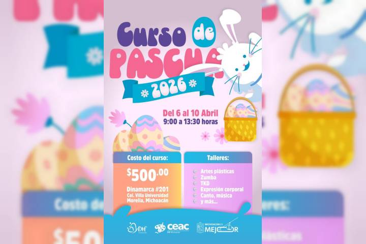 NOTICIAS 17/03/2026DIF Michoacán invita al Curso de Pascua 2026 para niñas y niñosLa directora general del Sistema DIF Michoacán, Ana Sofía Bautista Aguíñiga, informó que el Centro de Educación Artística y Cultural (CEAC) iniciará inscripciones para su Curso de Pascua a partir del 19 de marzo, en un horario de 9:00 a 14:00 y de 16:00 a 20:00 horas, con un costo de 500 pesos por participante.