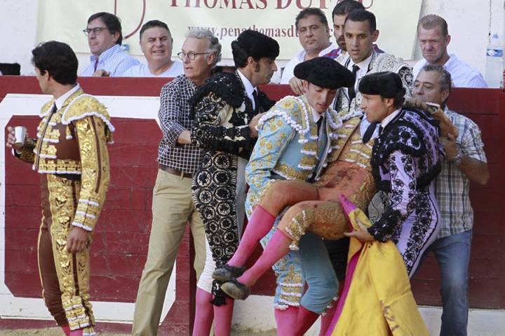 El torero resbaló al intentar hacer un quite a un toro de su compañero Juan del Álamo, cayó al suelo y allí el astado, perteneciente a la ganadería española de Baltasar Ibán, lo corneó en el costado derecho.