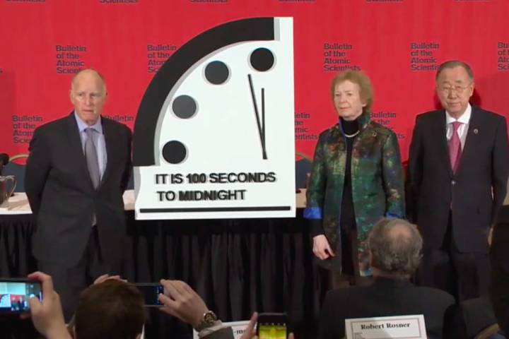 NOTICIAS 02/02/2020El "reloj del fin del mundo" esta cerca de cambios irreversiblesEl cambio climático y las armas nucleares nos han colocado en el momento más cercano al punto sin retorno, según el "reloj del fin del mundo", un indicador creado en 1947, afirmó Jans Fromow Guerra, investigador de la UNAM.