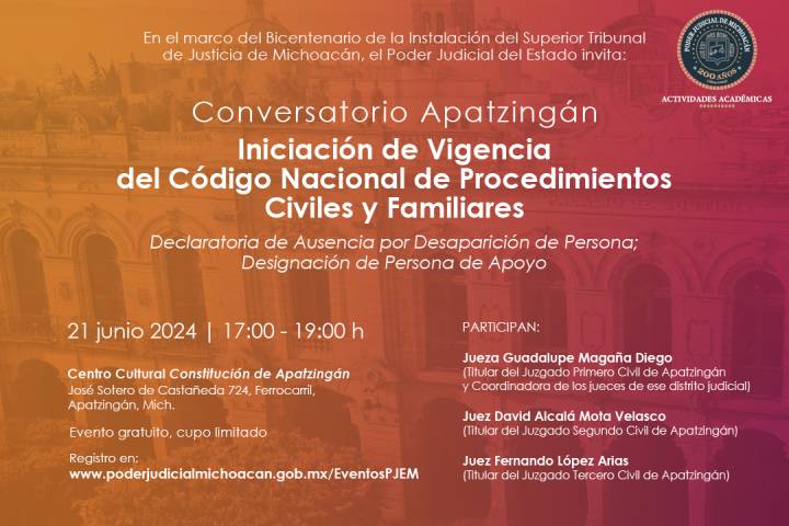 NOTICIAS 17/06/2024Apatzingán será sede del conversatorio para analizar el nuevo Código Nacional de Procedimientos Civiles y Familiares El Centro Cultural Constitución de Apatzingán será sede del conversatorio Iniciación de Vigencia del Código Nacional de Procedimientos Civiles y Familiares que tiene por objeto analizar las novedades incluidas en la normativa y que se realizará el viernes 21 de junio a las 17:00 horas.