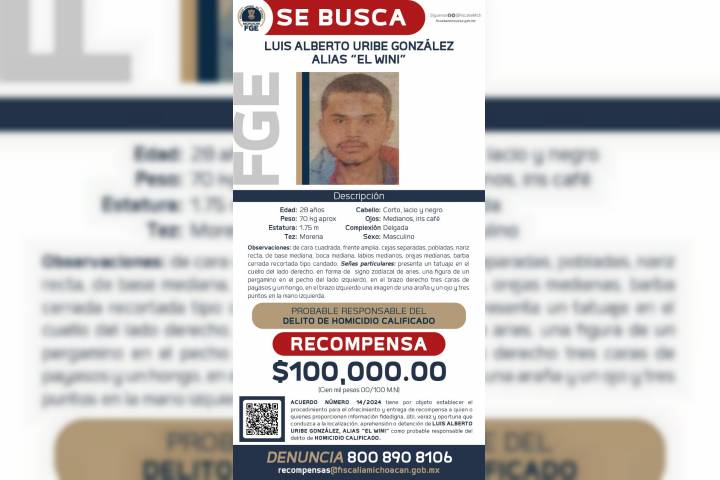 NOTICIAS 10/04/2024Ofrece FGE recompensa para la detención el Wini, presunto responsable del homicidio del aspirante a la presidencia de MaravatíoResultado de trabajos de investigación realizados por la Fiscalía General del Estado de Michoacán (FGE), con relación al homicidio de Armando Pérez Luna, precandidato del Partido Acción Nacional (PAN), ocurrido el pasado e27 de febrero, se logró establecer la presunta autoría material de Luis Alberto Uribe González, el Wini, por lo que emitió cédula de ofrecimiento de recompensa para quien proporcione información que permita su deten... Ver más...