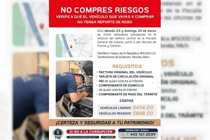 NOTICIAS 23/03/2024 ¡No compres riesgos!, verifica que tu vehículo no tenga reporte de roboComo parte de las acciones encaminadas a inhibir conductas ilícitas, la Fiscalía General del Estado de Michoacán (FGE) exhorta a la ciudadanía a verificar vehículos antes de realizar cualquier compra y pone a su disposición el módulo de verificación de vehículos.