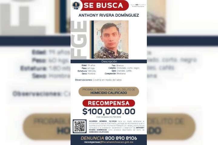NOTICIAS 06/03/2024FGE ofrece 100 mp por presunto homicida del Dr. Zavala, precandidato de Morena a la alcaldía de Maravatío Un total de 100 mil pesos es lo que ofrece la Fiscalía General del Estado (FGE) por información útil y oportuna que lleve a la captura de Anthony Rivera Domínguez, identificado como el probable responsable del homicidio del doctor Miguel Ángel Reyes Zavala, precandidato del partido Morena a la alcaldía de Maravatío.