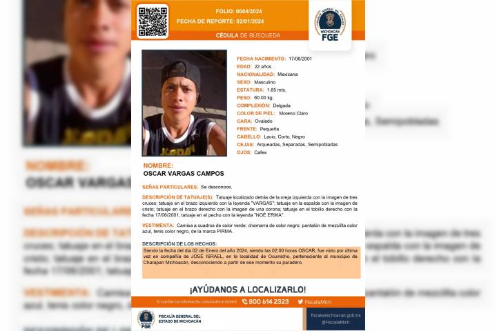 La Fiscalía General del Estado de Michoacán (FGE) emprendió actos de investigación de campo y de gabinete para esclarecer la desaparición y establecer el paradero de los comuneros de Santa Cruz Tanaco, José Israel Vargas Jerónimo y Oscar Vargas Campos. Tras recibir la denuncia de la desaparición de los comuneros registrada aproximadamente a las 02:00 horas, en la carretera Tangancícuaro-Ocumicho, la Fiscalía General del Estado activÃ...