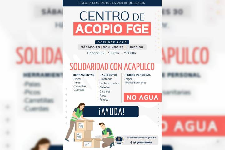 NOTICIAS 27/10/2023Instala FGE centro de acopio para damnificados del estado de GuerreroSolidaria con la población del estado de Guerrero, la FiscalÃa General del Estado de Michoacán (FGE), instalará, a partir del sábado 28 de octubre y hasta el próximo lunes, un centro de acopio de alimentos no perecederos que serán enviados a los damnificados por el paso del huracán Otis.