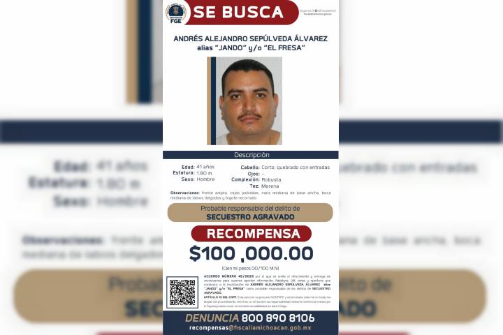 La Fiscalía General del Estado de Michoacán (FGE) expidió el acuerdo por el que se emite el Ofrecimiento y Entrega de Recompensa para quienes aporten información fidedigna, útil y oportuna que conduzca a la localización y detención de 11 personas presuntas integrantes de dos células criminales. Se trata de Andrés Alejandro Sepúlveda Álvarez, "Jando y/o El Fresa", César Alejandro Sepúlveda Arellano, "El Boto y/o El Botox" Nicolás ...