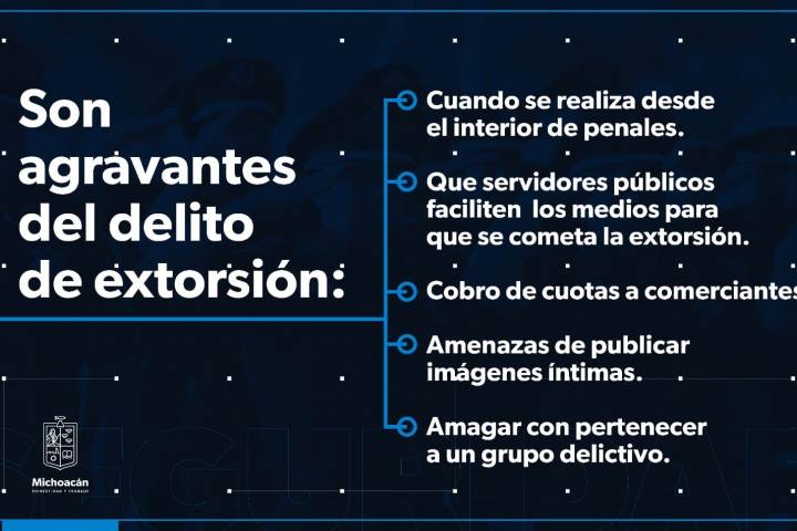 En Michoacán el delito de extorsión se castiga con penas más severas, luego de la entrada en vigor el pasado 2 de marzo de la reforma a al Código Penal para el Estado de Michoacán, que establece hasta 25 años de prisión y multas equivalentes a 500 días. Con esta modificación a la ley, ya no se requiere denuncia, es decir que una vez que la autoridad tome conocimiento de la posible comisión de este delito, podrá intervenir de maner...