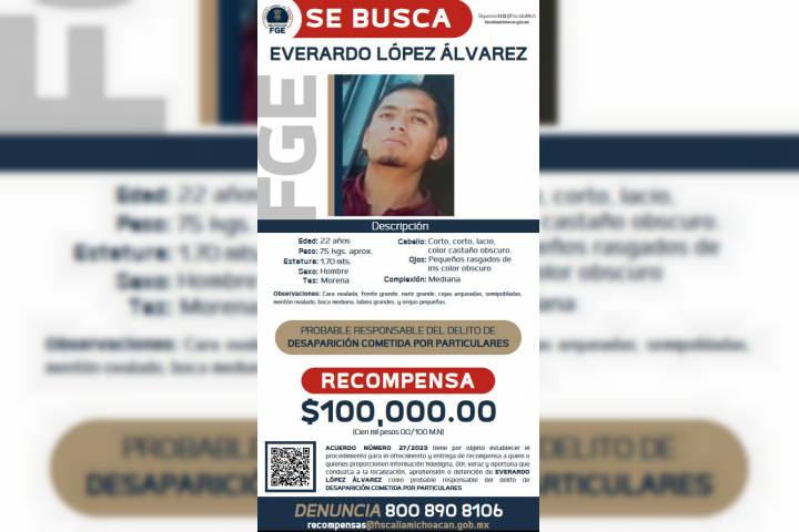 La Fiscalía General del Estado de Michoacán (FGE) expidió el acuerdo por el que se emite el Ofrecimiento y Entrega de Recompensa para quienes aporten información fidedigna, útil y oportuna que conduzca a la localización y detención de Everardo López Álvarez, por su posible relación en el delito de desaparición cometida por particulares. Derivado de las actuaciones emprendidas por la institución, se pudo establecer la identidad y ...