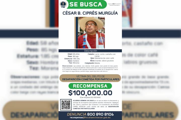 La Fiscalía General del Estado de Michoacán (FGE) expidió el acuerdo por el que se emite el Ofrecimiento y Entrega de Recompensa, para quienes aporten información fidedigna, útil y oportuna que conduzca a la localización de César B. Ciprés Murguía, víctima del delito de desaparición cometida por particulares.