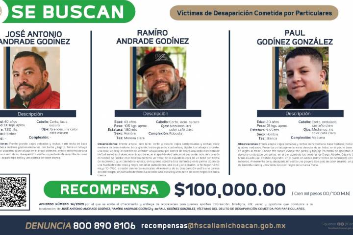 La FiscalÃa General del Estado de Michoacán (FGE), expidió el acuerdo por el que se emite el Ofrecimiento y Entrega de Recompensa para quienes aporten información fidedigna, útil y oportuna que conduzca a la localización de, José Antonio Andrade GodÃnez, Ramiro Andrade GodÃnez y Paul GodÃnez González, vÃctimas del delito de desaparición cometida por particulares.