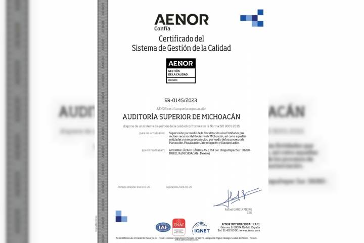 La Auditoría Superior de Michoacán (ASM), logró la certificación en Sistema de Gestión de Calidad ISO 9001:2015 con la casa certificadora AENOR; convirtiéndose en el primer ente de fiscalización en el país en obtenerla para la totalidad de sus procesos; tales como, Planeación, Fiscalización, Investigación y Substanciación de Responsabilidades Administrativas que desarrolla la dependencia.