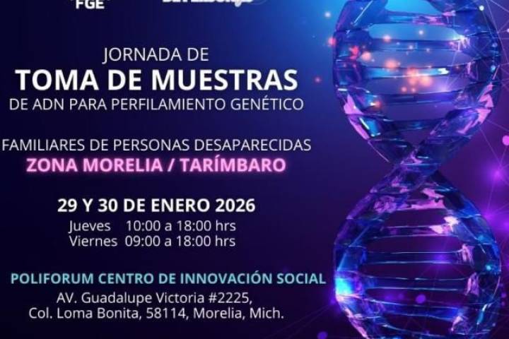 NOTICIAS 29/01/2026FGE invita a participar en la 1ª Jornada de Toma de Muestras de ADN La Fiscalía General del Estado de Michoacán (FGE), a través de la Fiscalía Especializada en Desaparición Forzada y Desaparición Cometida por Particulares, invita a la ciudadanía a participar en la 1ª Jornada de Toma de Muestras de ADN, que se llevará a cabo los días 29 y 30 de enero.