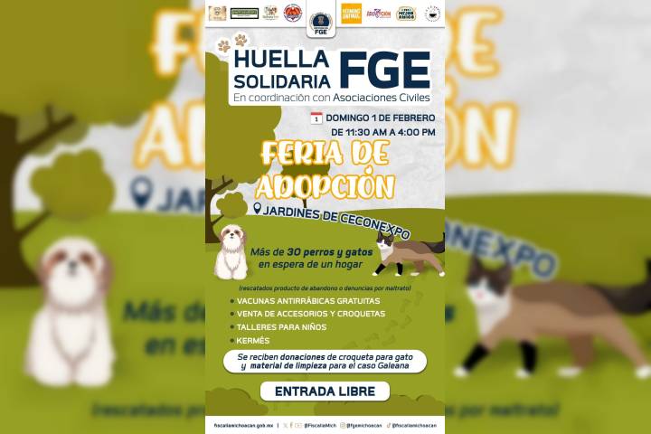 NOTICIAS 30/01/2026Invita FGE a la Feria de Adopción "Huella Solidaria" en coordinación con Asociaciones CivilesLa Fiscalía General del Estado de Michoacán (FGE), en coordinación con diversas asociaciones civiles dedicadas a la protección y bienestar animal invita a la ciudadanía a participar en la Feria de Adopción "Huella Solidaria", una actividad que tiene como propósito principal fomentar la adopción responsable, fortalecer la cultura del respto hacia los seres sintientes y promover la participación sociales en acciones que contribuyen a la re... Ver más...