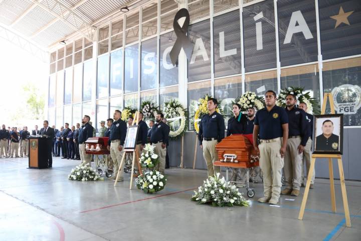 NOTICIAS 05/04/2023Rinde Fiscalía General, homenaje luctuoso a policías de investigación fallecidos en cumplimiento de su deberLa coordinación de acciones interinstitucionales ha sido clave para garantizar a la ciudadanía, las condiciones de paz y tranquilidad que merecen, y que es responsabilidad de las autoridades, no obstante, es inadmisible que, para cumplir con ese propósito, se deba pagar con la vida, expuso el titular de la Fiscalía General del Estado de Michoacán (FGE) Adrián López Solís, durante el homenaje luctuoso a Edgar Eduardo Delgado Bedolla y Yona... Ver más...