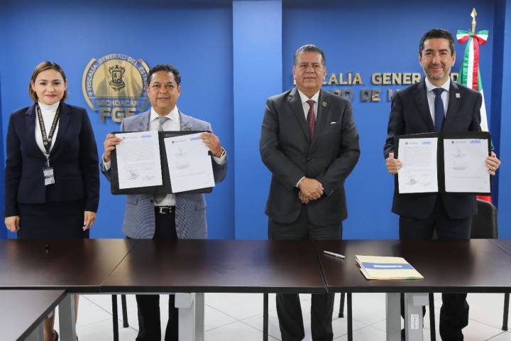 NOTICIAS 31/03/2023FGE y UVAQ firman convenio de colaboración en favor del sector estudiantil en la entidadCon el objetivo de contribuir en la formación profesional del sector estudiantil que lleva a cabo su servicio social y facilitar la liberación de prácticas profesionales, este viernes la FiscalÃa General del Estado de Michoacán (FGE) y la Universidad Vasco de Quiroga (UVAQ), firmaron un convenio de colaboración.