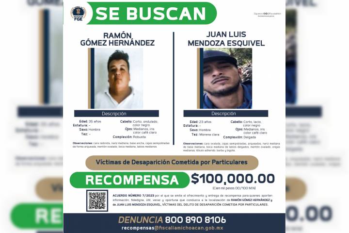 NOTICIAS 22/02/2023Ofrece FGE recompensa para localizar a Ramón Gómez Hernández y Juan Luis Mendoza EsquivelLa Fiscalía General del Estado de Michoacán (FGE), expidió el acuerdo por el que se emite el Ofrecimiento y Entrega de Recompensa para quienes aporten información fidedigna, útil y oportuna que conduzca a la localización de, Ramón Gómez Hernández y Juan Luis Mendoza Esquivel, víctimas del delito de desaparición cometida por particulares.