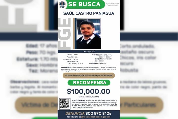 NOTICIAS 22/02/2023Ofrece FGE recompensa para localizar a Saúl Castro Paniagua, víctima de desaparición cometida por particulares La Fiscalía General del Estado de Michoacán (FGE) expidió el acuerdo por el que se emite el Ofrecimiento y Entrega de Recompensa para quienes aporten información fidedigna, útil y oportuna que conduzca a la localización de Saúl Castro Paniagua, víctima del delito de desaparición cometida por particulares.