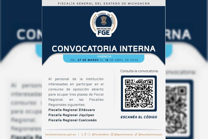 Con el objetivo de fortalecer la procuración de justicia y garantizar la selección de perfiles altamente capacitados, la Fiscalía General del Estado de Michoacán (FGE), encabezada por su titutal Carlos Torres Piña, emitió una convocatoria para participar en el concurso de oposición abierto para la designación de las fiscales regionales de Coalcomán, Jiquilpan y Zitácuaro. La convocatoria está dirigida tanto a personal adscrito a la...