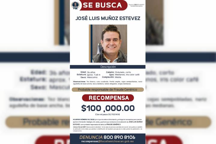 La FiscalÃa General del Estado de Michoacán (FGE) emitió el Ofrecimiento y Entrega de Recompensa para todas aquellas personas que coadyuven en la aportación de información fidedigna, útil y oportuna que conduzca a la localización de José Luis Muñoz Estevez, por su probable participación en la comisión de hechos posiblemente constitutivos del delito de fraude genérico.