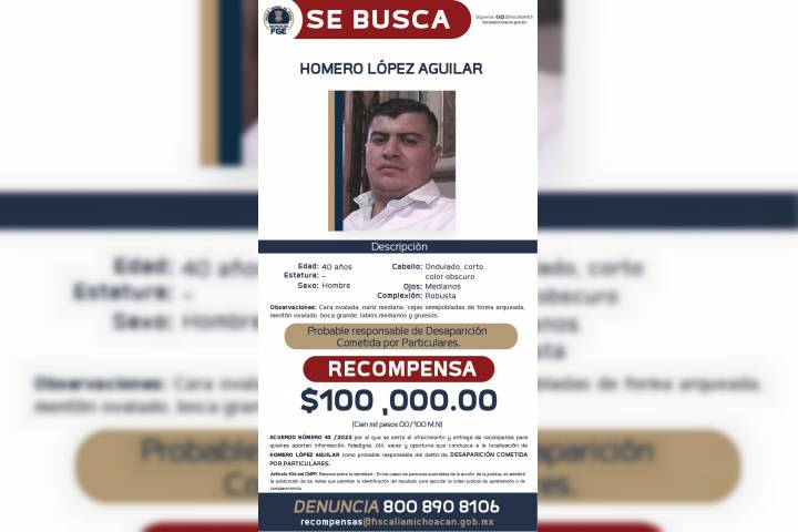 La FiscalÃa General del Estado de Michoacán (FGE) expidió los acuerdos por los que se emite el Ofrecimiento y Entrega de Recompensa para quienes aporten información fidedigna, útil y oportuna que conduzca a la localización de Homero López Aguilar, por su posible relación en el delito de desaparición cometida por particulares, cometido en agravio de una mujer, en este municipio.