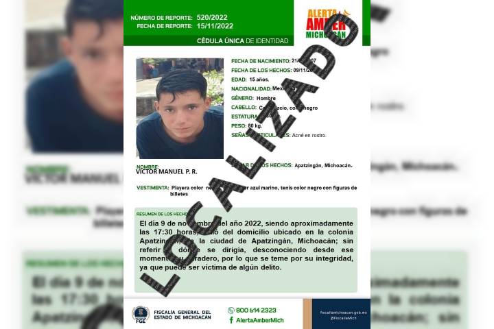 La Fiscalía General del Estado de Michoacán (FGE), localizó ileso a un adolescente que el pasado 15 de noviembre, fue reportado como desaparecido en el municipio de Apatzingán.