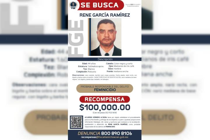 Como parte de las acciones de investigación que realiza la Fiscalía General del Estado de Michoacán (FGE) para garantizar el acceso a la justicia a las víctimas de violencia de género, la institución emitió un acuerdo de ofrecimiento de recompensa para quien aporte información que permita la localización y detención de René García Ramírez, presunto responsable del delito de feminicidio. De las constancias que integran la Carpeta ...