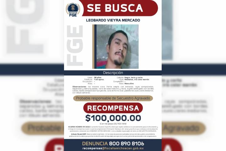 NOTICIAS 20/10/2022Ofrece FGE recompensa para la detención de tres presuntos responsables del secuestro La FiscalÃa General del Estado de Michoacán (FGE) expidió los acuerdos por los que se emite el Ofrecimiento y Entrega de Recompensa para quienes aporten información fidedigna, útil y oportuna que conduzca a la localización de Leobardo Vieyra Mercado, Daniel Villanueva Cabrera y Ramón Humberto Galván Chacón y/o Ramón Humberto Valencia Chacón, por su posible relación en el delito de secuestro agravado, cometido contra una adolescente de... Ver más...