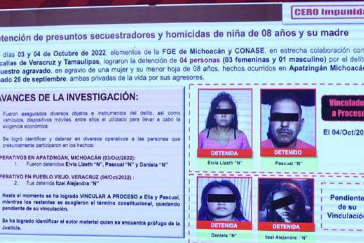 NOTICIAS 07/10/2022Vinculadas a proceso a cuatro personas por secuestro y homicidio de madre e hija, ocurrido en ApatzingánLa FiscalÃa General del Estado de Michoacán (FGE) obtuvo de un Juez de Control vinculación a proceso contra un hombre y tres mujer, presuntas responsables del secuestro y homicidio de Miriam Monserrat M. y de su hija de 8 años, registrado el pasado 26 de septiembre, en el municipio de Apatzingán.