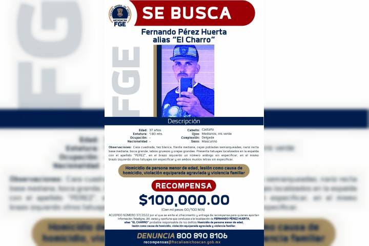 NOTICIAS 09/10/2022Ofrece FiscalÃa General recompensa para localizar y detener a Fernando Pérez HuertaLa FiscalÃa General del Estado de Michoacán (FGE) expidió el acuerdo por el que se emite el Ofrecimiento y Entrega de Recompensa para quienes aporten información fidedigna, útil y oportuna que conduzca a la localización de Fernando Pérez Huerta, alias "El Charro", por su posible relación en los delitos de homicidio de persona menor de edad, violación equiparada agravada y violencia familiar, perpetrado en agravio de un niño de 3 años.