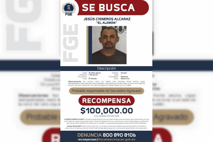NOTICIAS 12/10/2022Ofrece FGE recompensa para la detención de tres presuntos responsables del secuestro agravado de una mujerLa FiscalÃa General del Estado de Michoacán (FGE) expidió los acuerdos por los que se emite el Ofrecimiento y Entrega de Recompensa para quienes aporten información fidedigna, útil y oportuna que conduzca a la localización de Jesús Cisneros Alcaraz, "El Alemán", Eliseo Cervantes Lemus, "El Naco" y Jesús GarcÃa Laguna, "El Verde", por su posible relación en el delito de secuestro agravado, cometido contra una mujer, en el municipio de J... Ver más...