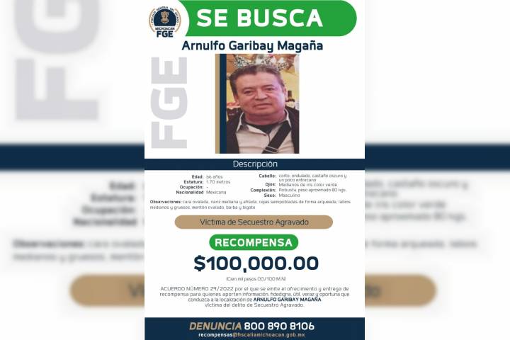 La FiscalÃa General del Estado de Michoacán (FGE) expidió el acuerdo por el que se emite el Ofrecimiento y Entrega de Recompensa para quienes aporten información fidedigna, útil y oportuna que conduzca a la localización de Arnulfo Garibay Magaña, vÃctima de secuestro agravado; hechos ocurridos en el municipio de Ecuandureo.
