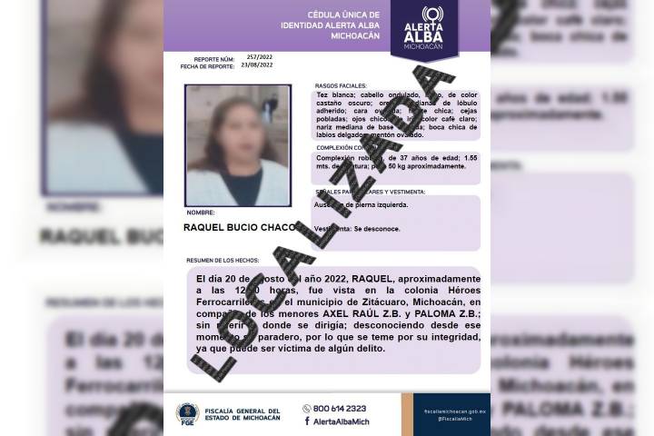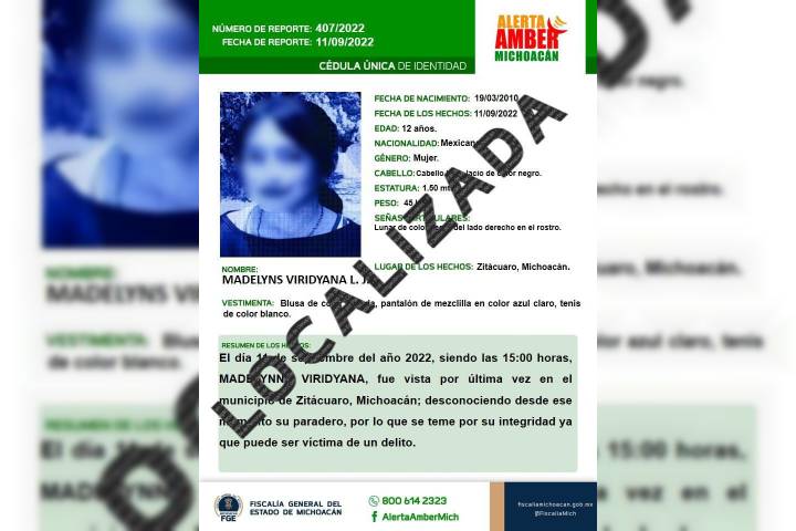 La FiscalÃa General del Estado de Michoacán (FGE) desactivó Alerta Amber tras localizar -sana y salva- a una adolescente de 12 años, quien el domingo pasado fue reportada como desaparecida en el municipio de Zitácuaro.