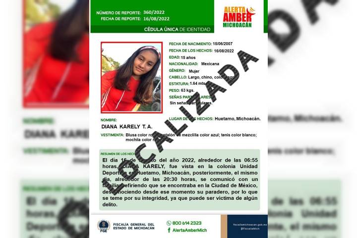 NOTICIAS 18/08/2022Desactiva FGE Alerta Amber, tras localizar a adolescente reportada como desaparecida en Huetamo