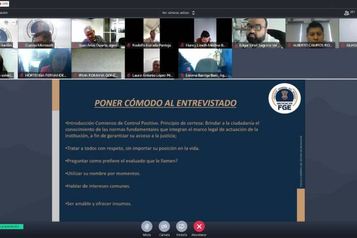 NOTICIAS 19/08/2022Imparte FGE curso "Introducción a la Técnica de Entrevista Especializada" En seguimiento a las acciones emprendidas dentro del esquema denominado "Jueves de Capacitación" para la profesionalización del personal, la Fiscalía General del Estado de Michoacán (FGE), a través del Instituto de Capacitación y Servicio Profesional de Carrera, impartió el curso "Introducción a la Técnica de Entrevista Especializada".