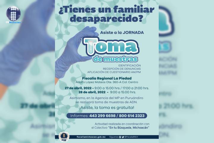 NOTICIAS 26/04/2022Realizará FGE jornada de toma de muestras de ADN en La Piedad Como parte de los trabajos para coadyuvar en las acciones de búsqueda y localización de personas desaparecidas, la Fiscalía General del Estado de Michoacán (FGE) en coordinación con el colectivo "En tu Búsqueda Michoacán" llevará a cabo una jornada de toma de muestras de ADN, los días 27 y 28 de abril, en La Piedad.