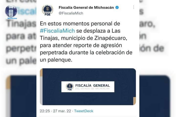 NOTICIAS 28/03/2022Continúa la Fiscalía General del Estado, con actuaciones por hechos registrados en Zinapécuaro Con relación a hechos registrados anoche, mientras se realizaba un palenque en el municipio de Zinapécuaro, la Fiscalía General del Estado (FGE) continúa con diligencias en el lugar; ahí fueron asegurados 15 vehículos y se realizaron actuaciones con relación a cinco personas que fueron reportadas lesionadas en diferentes nosocomios, una de ellas murió en el trayecto.