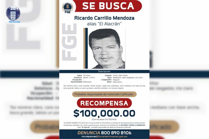 NOTICIAS 28/03/2022Ofrece FGE 100 mil pesos de recompensa para localizar a "El Alacrán", presunto homicida de alcalde de Aguililla