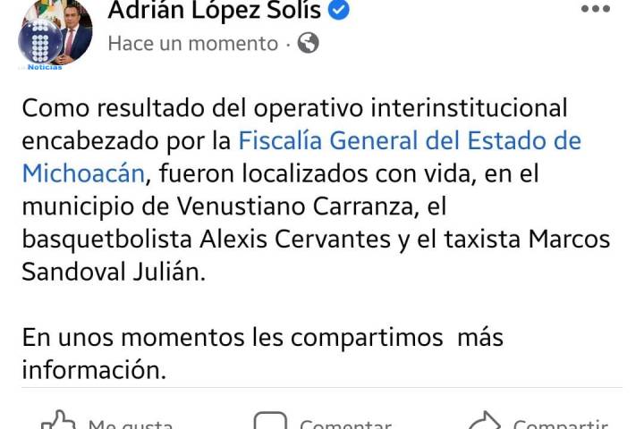 NOTICIAS 29/12/2021FGE Localiza con vida a basquetbolista y taxista desaparecidosLa mañana de este miércoles, el Fiscal del Estado de Michoacán Adrián López Solís informó a través de su cuenta oficial de Twitter que fueron localizados con vida el basquetbolista Alexis Cervantes y el taxista Marcos Sandoval, en un municipio ubicado en los límites con el vecino estado de Jalisco.