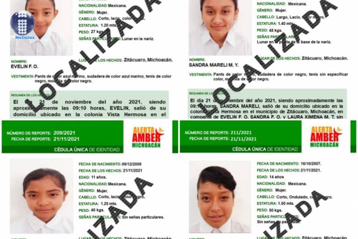 NOTICIAS 05/01/2022Localiza Fiscalía General a 4 menores reportadas como desaparecidas en Zitácuaro La Fiscalía General del Estado de Michoacán (FGE) en coordinación con autoridades del Estado de México, localizó sanas y salvas a cuatro menores de edad que fueron reportadas como desaparecidas en Zitácuaro.